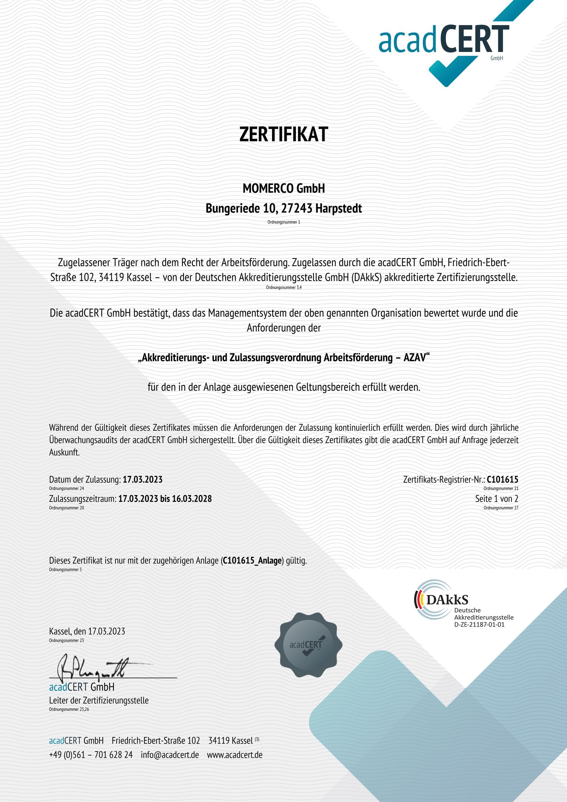 Momerco ist mit seiner Marke JobTIXX ist eine innovative Stellenvermittlung, die Arbeitgeber und Bewerber durch FairRecruiting zu gleichen Bedingungen zusammenbringt. Gleichzeitig steht die Momerco GmbH für bedarfs- und schülerorientierte Bildungsmaßnahmen und garantiert Qualität in der Bildung. Dieses haben wir durch unsere AZAV Zertifizierung unter Beweis gestellt